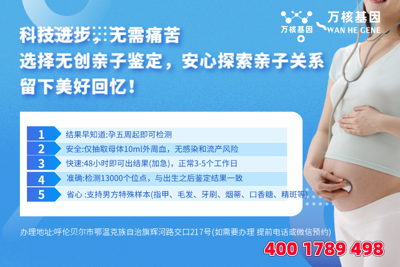 具体鉴定方案可咨询鄂温克亲子鉴定基因检测办理地址:呼伦贝尔市鄂温克族自治旗辉河路交口217号(如需要办理 提前电话或微信预约)-预约电话:4001789498,鄂温克亲子鉴定基因检测以诚信为本,秉承拒绝一切“真”、“精”的原则,为广大客户提供精准、高效、保密的dna亲子鉴定的服务。